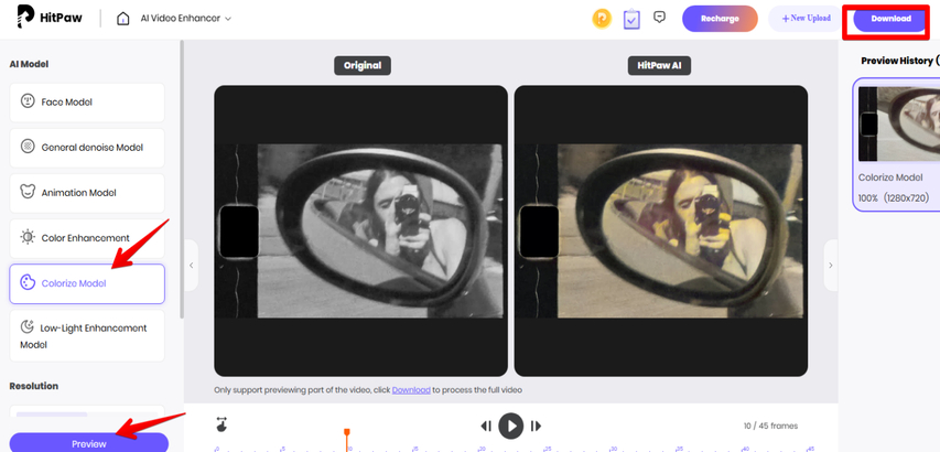 Step 1.Open HitPaw VikPea, click "Video Enhancer," upload your video, select the Colorize model on the right menu, and click "Preview."